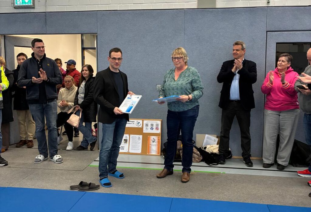 Die offizielle Aufnahmeurkunde erhielten wir heute im Rahmen des Trainings aus den Händen von Annette Hülemeyer (KSB Borken) im Beisein von Bürgermeister Jörg von Borczyskowski sowie Gabi Könemann und Thomas Buß vom StadtSportVerband Gronau.